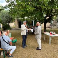 L’un des privilèges d’être un Rotarien est d’être invité à visiter l’un des 46.000+ clubs à travers le monde. Lors de la cérémonie de passation, c’est ce qu’a fait le distingué Dr Martin Exner MD, membre du club Rotarien de Bonn-Kreuzberg en Allemagne. Dr. Exner vient régulièrement en France, vivant à Rousset-les-Vignes. On lui a remis le fanion du club et il a fait part aux membres de sa vaste expérience, dont celle d’être l’un des sept membres du Comité consultatif Corona de l’ancienne chancelière allemande Angela Merkel. Martin a dit au groupe, « Je suis d’autant plus heureux d’avoir trouvé aujourd’hui le contact avec votre club et votre invitation, et je me permets de vous transmettre les meilleures salutations de notre club de Bonn, Bonn Kreuzberg. »