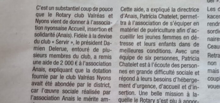 Le club a remis un chèque de 2000 euros a’ l’Association Anais. Cette aide permettra a’ l’association de s’équiper en matérial de puériculture afin d’acceuillir les jeunes femmes en détresse et leurs enfants dans...